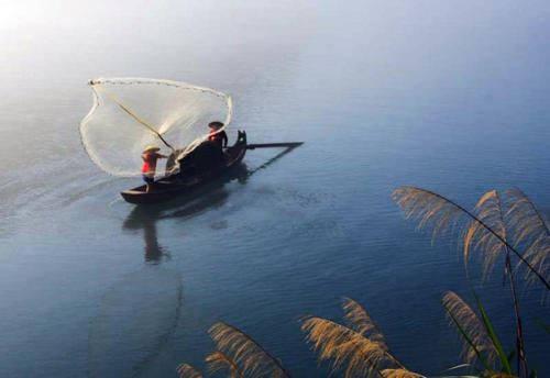 28.薄暮下,湖上笼罩着一抹轻烟,船影隐约,渔歌飘渺。
